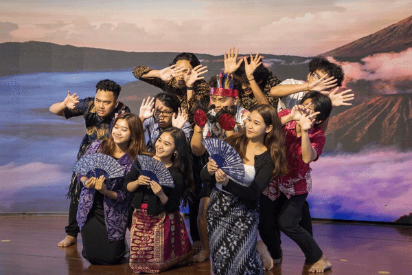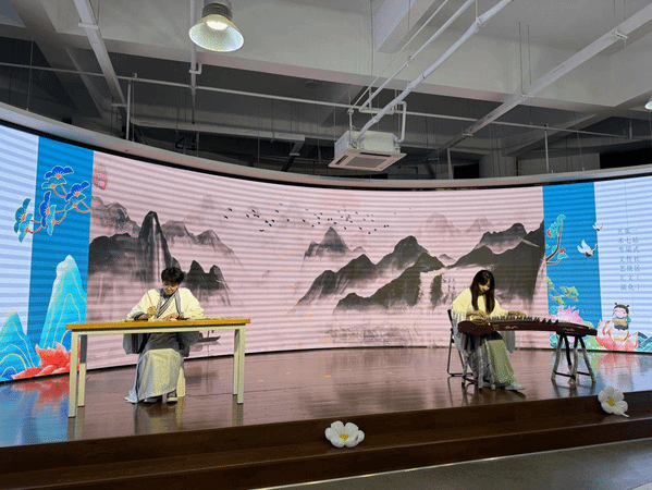 本场文艺汇演为师生呈现了一场充满传统韵味与创新表达的文化盛宴。活动伊始,校团委刘婷婷老师以一首《敕勒歌》开场,将歌中的豪迈和柔情展现的淋漓尽致,赢得台下阵阵掌声。接下来的节目精彩纷呈,反响热烈。同学们身着传统服饰,或翩翩起舞,或抚琴吟唱,或挥毫泼墨,将传统与现代元素巧妙融合,展现出了中华文化的独特魅力。诗朗诵《何以华夏,何以中国》,慷慨激昂;舞蹈《鸳鸯戏》,抒情柔美;歌曲《美美》婉转悠扬,致敬中国动画百年;小品《四大才子》幽默诙谐,惹得全场欢呼爆笑。此外协办单位也为本次文艺汇演带来了精彩的表演。洛社镇正明村舞蹈队带来的舞蹈《老百姓的好心情》展现了当下普通老百姓的欢乐与和谐,爱尔兰学院的留学生们身着印度尼西亚传统服装带来别具特色的异域风情舞蹈,向观众们展示了当地的别样风格。