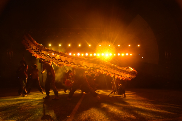晚会在体育部舞龙舞狮校队带来的舞龙表演中拉开帷幕,辗转腾挪间,尽显青年学生的朝气蓬勃。各社团表演各具特色,舞蹈、合唱、武术、小品、相声、器乐、朗诵等各类节目精彩纷呈,为全体观众带来了一场视听盛宴。由金话筒主持人社团表演的《百年传承》抑扬顿挫,慷慨激昂,吸引师生们凝神欣赏,将晚会气氛推向高潮。最终,在蠡溪书法协会、蠡溪画社、民族器乐协会和华之韵汉文社带来的歌舞《胭脂泪》中完美收官。
