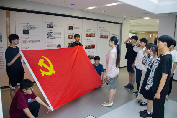 学习强国线下体验馆讲解员首先带领全体师生概览了各个功能区,就场馆建设的意义及使用情况做了介绍。随后,学生支部成员通过答题、唱红歌、VR骑行等沉浸式体验形式,认识了学习强国平台的各项功能。学生党员祁昕还在体验馆拍摄了题为《用好学习强国平台,争做新时代优秀党员》的主题微课,倡议更多青年学子了解并用好学习强国平台。学生党支部书记祁曼还带领支部新发展的预备党员,面向党旗,进行了庄严宣誓,完成了入党的重要仪式。祁曼对即将毕业的学生党员,提出了不忘初心,勇挑重担,争做先锋的发展要求,希望他们在新的人生阶段依然永葆党员先进性。