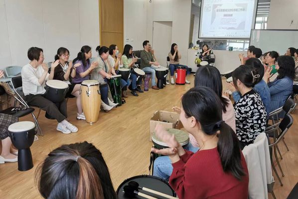 活动中,老师们围成一个椭圆形,在带领师的引导下拍打非洲鼓,感受音乐的律动和熏陶。过程中,带领师帮助团体成员学习节奏强弱、快慢、音高、乐器特色,并现场进行音乐的即兴演奏、回声演奏、分组演奏等,给大家创建愉悦、合作、互动的音乐氛围。之后,带领师作为音乐治疗师,带领大家用发出声音和身体摆动的方式,宣泄出内心的压力并放松身体肌肉群,帮助大家降低内心的焦虑情绪,放松身心,感受音乐的节奏与融入群体的温暖感,感受当下内心的真实自我,增强内心积极向上的心灵力量,能更好地应对未来生活中的各种困难,提高生活品质。