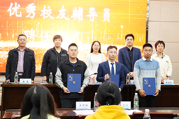 随后,领导们为到场的原广告71132班袁旭、原产品71631班王茂林、原数媒71931班岳高翔三位校友颁发了“优秀校友辅导员”聘书。