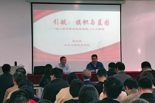 张鸣年作了题为《引航:旗帜与蓝图——深入学习贯彻落实党的二十大精神》专题讲座。他从党的二十大的重大意义、牢牢把握过去5年工作和新时代10年伟大变革的重大意义、牢牢把握习近平新时代中国特色社会主义思想的世界观和方法论、牢牢把握以中国式现代化推进中华民族伟大复兴的使命任务、牢牢把握以伟大自我革命引领伟大社会革命的重要要求、牢牢把握团结奋斗的时代要求共六个方面进行了精彩授课。张鸣年表示,学习宣传贯彻党的二十大精神,要坚持“五个牢牢把握”,把学习贯彻会议精神与自身职责使命紧密结合,明晰中国之理、中国之路、中国之治,传播中国声音、讲好中国故事。