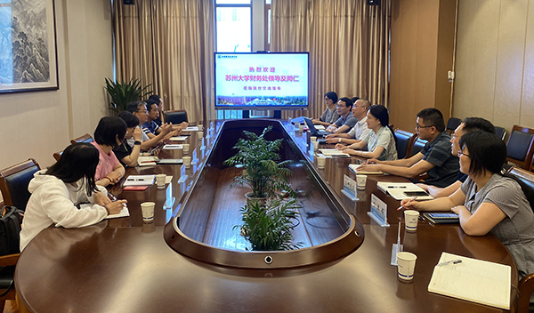 6月28日上午,苏州大学财务处处长陈永清一行莅临我校调研交流,我校副校长强伟纲、财务处、资产处相关负责人在综合楼F204会议室热情接待来访人员。