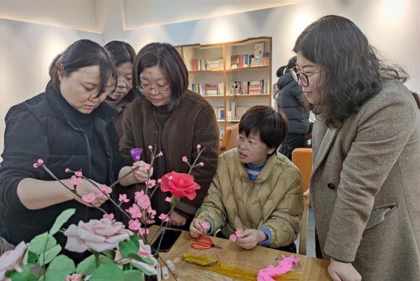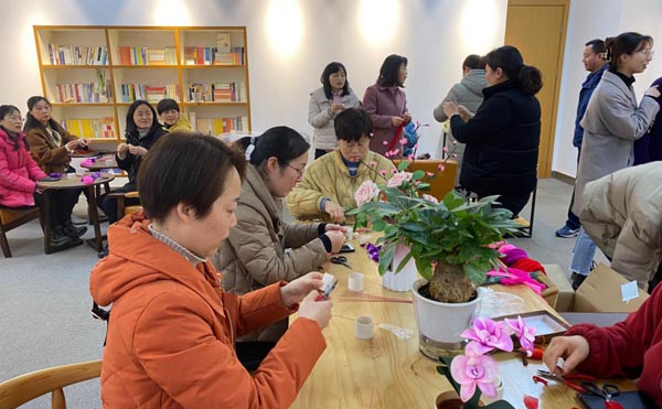 在陈老师悉心耐心指导下,老师们把学到的方法、技巧灵活地融入到自己的作品中,从选材、搭配到定型,展现了每个人对美的不同理解和构思。通过巧手将丝网花瓣组合成了一件件让人赏心悦目的艺术品,用花的独特语言展现了自然的生机,展示了对生活的体悟。最终,一朵朵优美典雅、风格迥异的丝网花儿经过一双双巧手以多姿多彩的形象呈现在大家眼前。面对自己“艺术的结晶”,女同胞们纷纷表示激发了自己的创作和审美潜力。