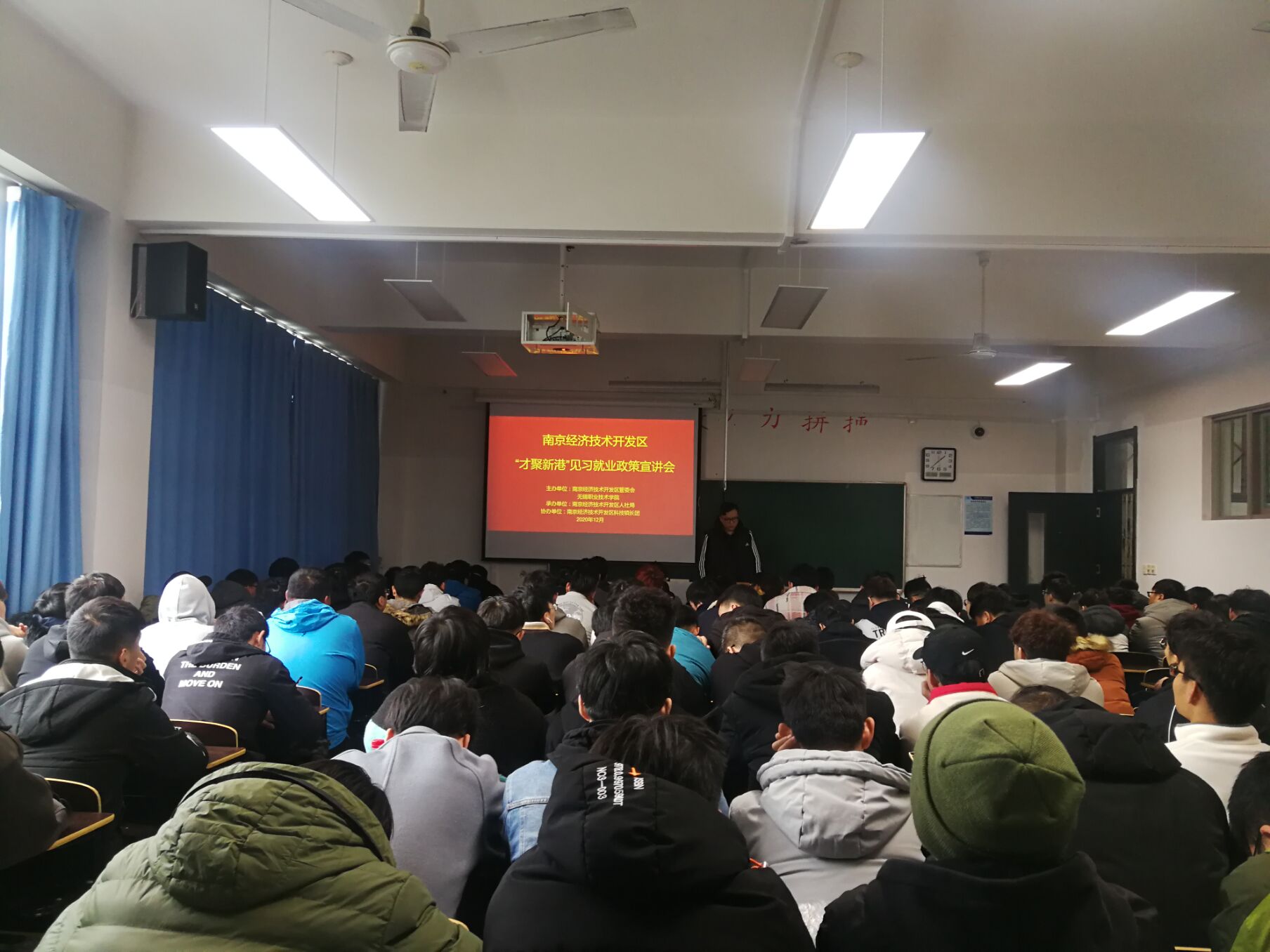 21日下午,南京市经开区“才聚新港”见习就业政策宣讲活动在我校教三209教室成功举办。来自南京经开区人社局的14名工作人员到场为同学们开展了到宁工作的政策宣讲,汽车与交通学院2018300多名同学分两个批次参加了该宣讲活动。活动现场,南京经开区人社局肖主任从见习申报条件、见习时间、补贴标准、报名流程、注意事项等方面对南京地区见习政策进行了全面解读,并从就业创业环境、就业支持政策等方面具体介绍了南京经开区的就业优势,向2021届汽车与交通学院毕业生发出了诚挚的就业邀请。