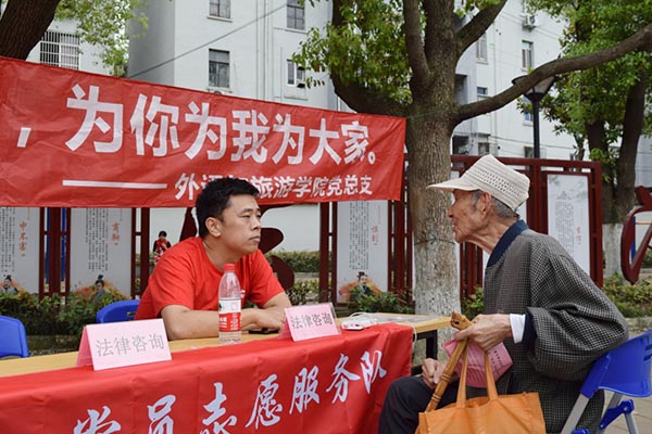 5月11日上午,中南社区联合外语与旅游学院学生党支部在中桥健身小公园内举办了一场主题为“以爱传爱”爱心义卖活动。社区工作人员和学校志愿者组织辖区内的家长和孩子,把从学校募集来的物品和社区家庭中带来的闲置物品进行义卖,筹集资金,帮助辖区内的贫困妈妈。5月14日下午,外语与旅游学院党总支教工第一党支部志愿服务队前往中南社区“法治小广场”,开展“老年人法律权益保护”法治宣传志愿服务活动,为社区老年人提供子女赡养、为子女购房、订立遗嘱、预防诈骗、预防旅游陷阱等方面的法律咨询服务。