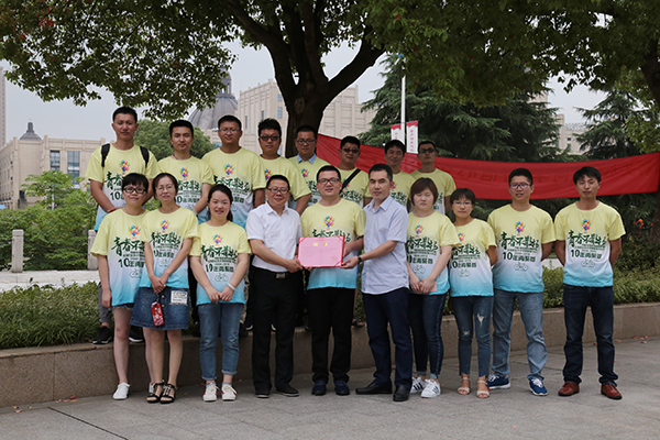 下午,机制10502班校友向母校捐赠3000元人民币,认养了一棵香樟树,徐晴书记给校友们颁发了捐赠证书。