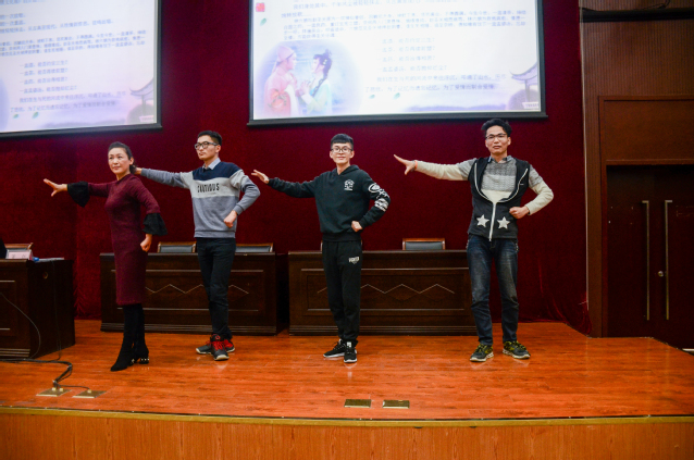 董红老师还现场邀请两组学生,手把手教导锡剧的出场、凝望等“手眼身法步”技法,还给参与互动的同学们赠送了锡剧名剧《三三》光碟。讲座中,董老师对锡剧艺术的热爱,对乐鱼app登录入口学生的关爱,获得全场学生的热烈欢迎,现场掌声阵阵、欢笑连连。