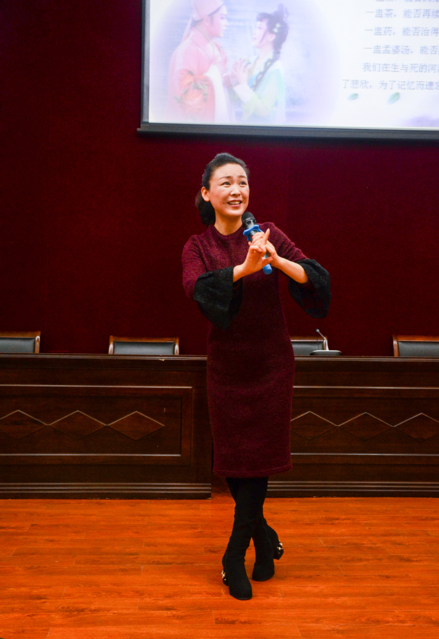 讲座中,董红老师从清末戏剧名画《同光十三绝》入手,介绍了戏剧的主要角色,详解了戏曲的三大表演体系,给同学们普及了戏曲的四功五法。董老师重点讲解了锡剧的历史发展进程,并用精彩的表演唱段,让同学们感受到锡剧“太湖一枝梅”(叶圣陶语)的独特魅力,设身处地领略到董老师扮相秀美俏丽、唱腔优美动听、表演惟妙惟肖的独特优点。