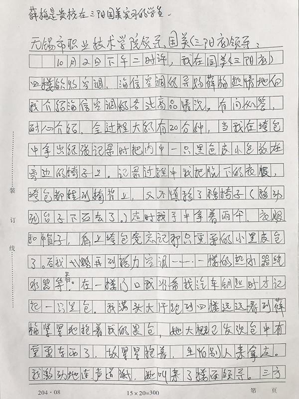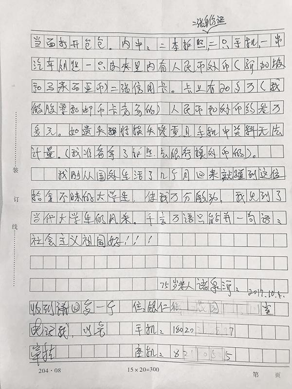 诸先生表示,自己刚回国不久,重要的证件均放在那只黑色皮包当中,而手机里的资料也并没有其他备份,如果找不回来将损失惨重。而做了好事的薛梅并没有对老师和同学们提起此事,直到老人通过工学结合单位打听,将感谢信辗转寄到学校。诸老先生表示,这个失而复得的黑色皮包让他看到了当代大学生的风采,并发自肺腑地感慨:社会主义祖国好!
