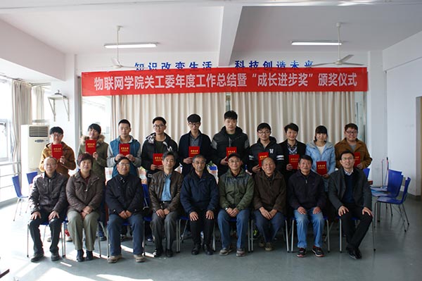 物联网学院院长刘全胜老师宣读了《关于授予李国亮等10位同学“成长进步奖”的表彰决定》,2016年在学习、生活、思想、行为等方面取得较大进步的10位同学获得“成长进步奖”证书,大家还就学习、生活等方面问题进行了互动。