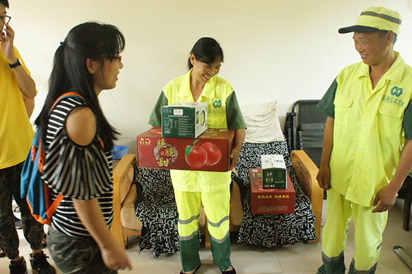 11日上午,志愿者们还将通过网上、地铁站、汽车站等募集来的爱心款购置了矿泉水、毛巾、手套等送到环卫师傅的手中,“这些都是我们平常干活的时候消耗最多的东西!”环卫工师傅感激地表示。