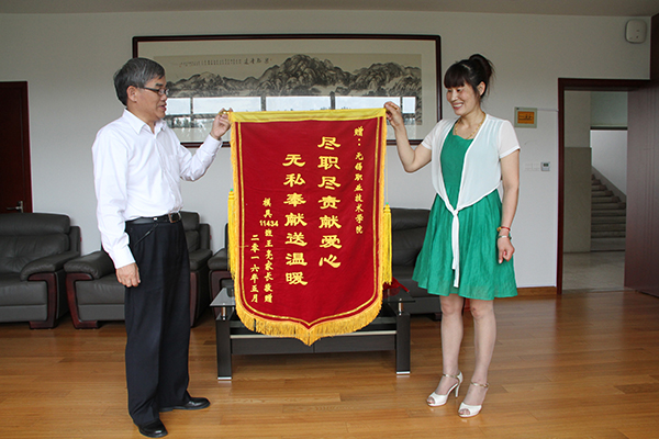 6月2日,我校模具11434班王亮同学的家人来到学校,将绣有“尽职尽责献爱心,无私奉献送温暖”字样的锦旗送到了学校,感谢学校在王亮因病送医期间对他的关怀和照顾。