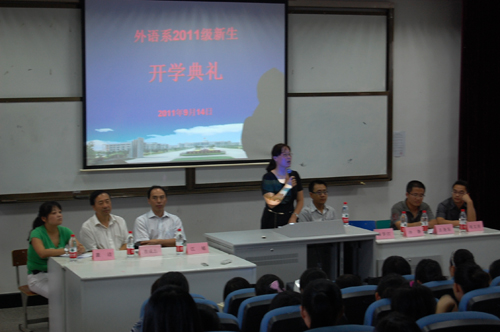 9月14日,外语系在J4-102举行2011级新生开学典礼,外语系党总支书记江铭、系主任曹成志、辅导员和各新生班班主任参加了典礼。