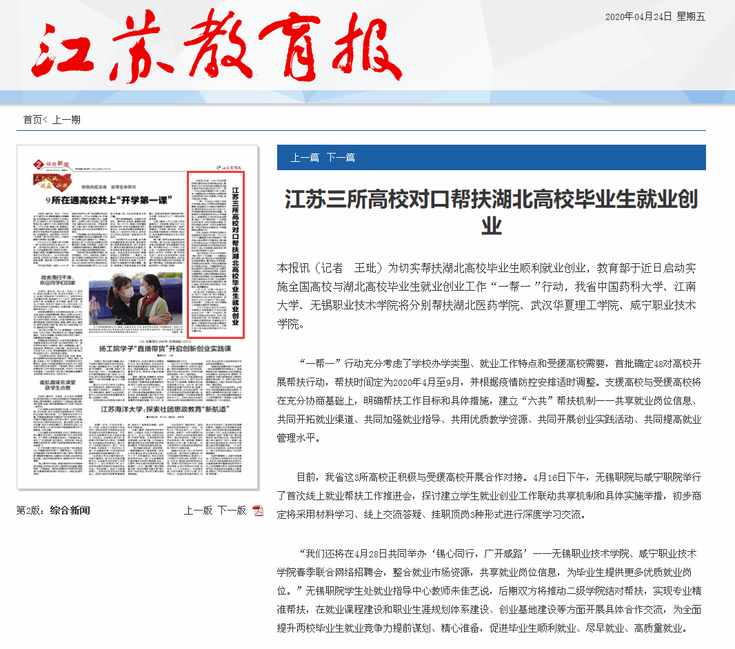 【江苏教育报】江苏三所高校对口帮扶湖北高校毕业生就业创业