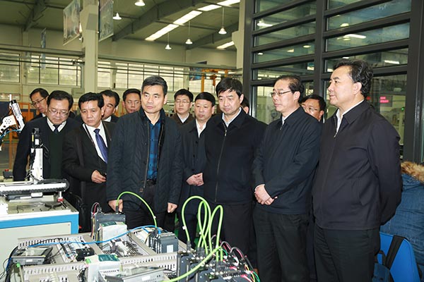 代表团一行先后来到我校智能制造工程中心和汽车与交通学院实训大厅,参观了数字化管控车间、五轴联动加工设备、我校自主研发的工业机器人技术应用平台和汽车检测与维修实训平台等,了解学校硬件环境和近年来贴近区域经济发展和产业转型升级培养人才所作出的努力。参观过程中,于丛乐书记和乌成云市长详细询问了我校专业建设、人才培养等方面的情况,并饶有兴趣地观看了实训学生装调、测试机器人技术应用平台操作。